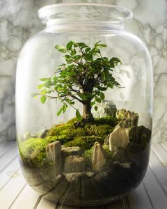 A terrarium is a miniature garden housed within a glass-sealed container that creates a self-sustaining ecosystem.